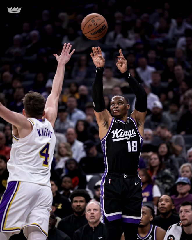 威少三分中的,他率队以8-0的反击波开始第四节,国王队反超3分。斯马特单打止血,萨博尼斯三分回应,里夫斯回到场上立即开火,连中2个三分球,湖人队以103-101重新领先2分。国王队之后进攻连续打铁,艾顿勾手得分,里夫斯三分中的,湖人队以108-101领先7分。拉文三分止血,八村塁命中两球,拉拉维亚弧顶投中三分,第四节还有4分15秒时湖人队以117-106领先。国王队没有放弃努力,连追6分,拉拉维亚打3分回应,拉文命中三分结束7-2的反击波,第四节还有1分30秒时国王队追至119-122。急于追分的国王队连续打铁,里夫斯四罚全中,湖人队以126-119领先。国王队之后无力回天,他们以120-127落败。